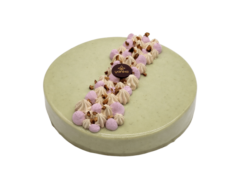 Financier pistache, insert crémeux pistache et mousse fruits des bois s’accordent pour offrir un entremets fondant, fruité et délicatement parfumé.